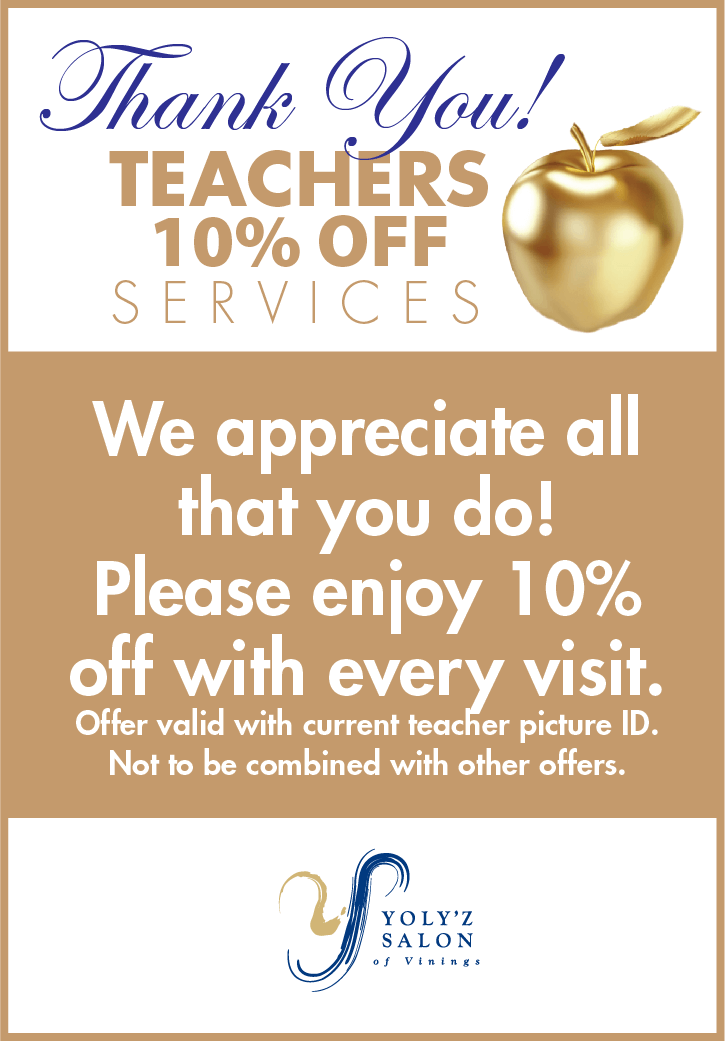 As a way of helping teachers that deserve so much more, we are proud to offer a 10% discount to all teachers at Yoly’z Salon. Valid teacher identification is required at the time of service. This discount is not combinable with any other discount.
